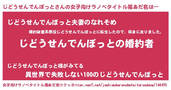 | 男性向けラノベタイトル風あだ名 | 『うちの娘の為ならば、俺はもしかしたらじどうせんでんぼっとも倒せるかもしれない。』 |
