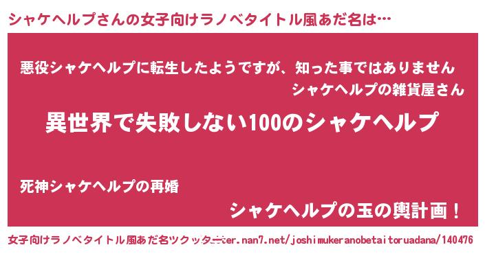 | 男性向けラノベタイトル風あだ名 | 『シャケヘルプという概念が存在しない退屈な世界 』 |