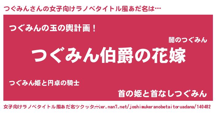 | 男性向けラノベタイトル風あだ名 | 『やはりつぐみんの青春ラブコメはまちがっている 』 |