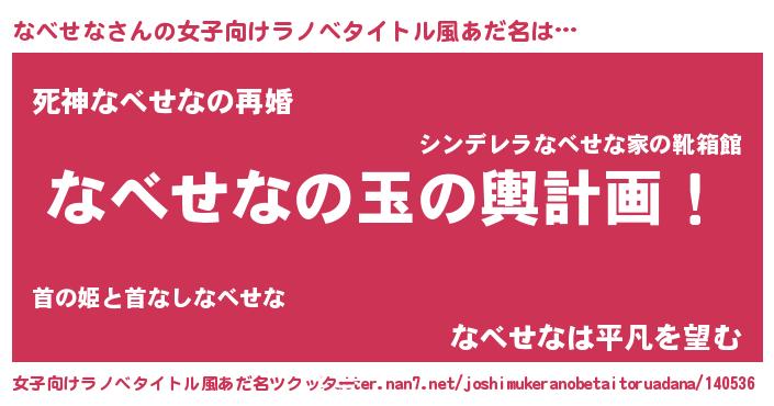 | 男性向けラノベタイトル風あだ名 | 『なべせな~年齢イコール彼女いない歴の魔法使い~』 |