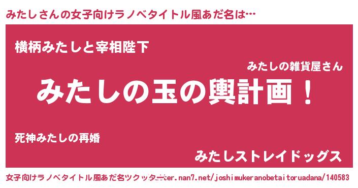 | 男性向けラノベタイトル風あだ名 | 『転生したらみたしだった件』 |