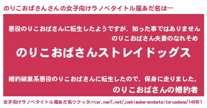 | 男性向けラノベタイトル風あだ名 | 『Re:のりこおばさんから始める異世界生活』 |