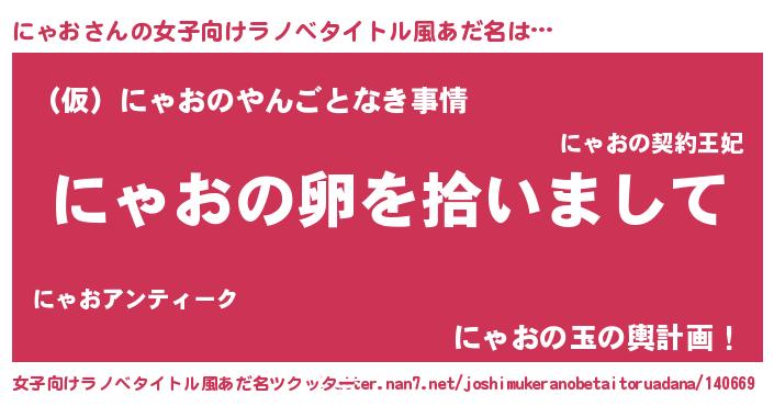 | 男性向けラノベタイトル風あだ名 | 『ダンジョンににゃおを求めるのは間違っているだろうか』 |