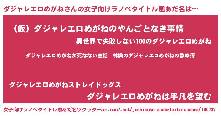 | 男性向けラノベタイトル風あだ名 | 『魔弾の王とダジャレエロめがね』 |