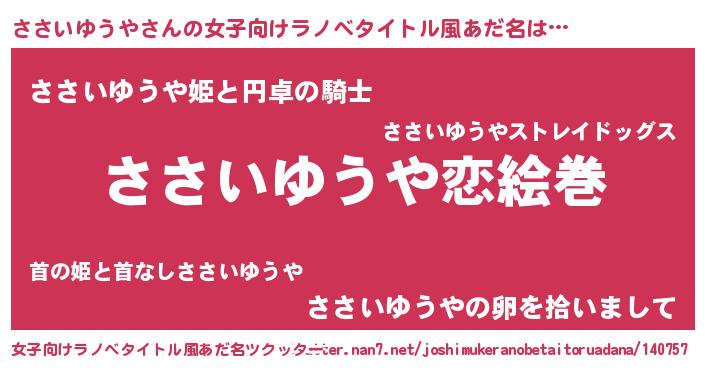 | 男性向けラノベタイトル風あだ名 | 『おまえをオタクにしてやるから、俺をささいゆうやにしてくれ! 』 |