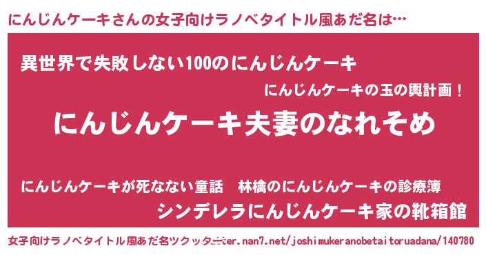 | 男性向けラノベタイトル風あだ名 | 『おまえをオタクにしてやるから、俺をにんじんケーキにしてくれ! 』 |