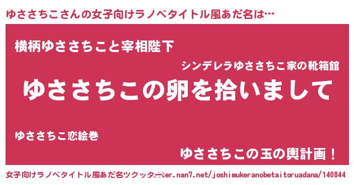 | 男性向けラノベタイトル風あだ名 | 『ゆささちこの嫁は女の子じゃないと思った?』 |