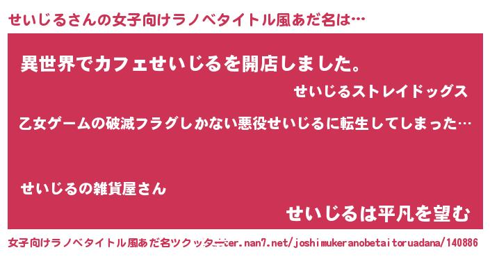 せいじるさんの女子向けラノベタイトル風あだ名は… 『乙女ゲームの破滅フラグしかない悪役せいじるに転生してしまった…』『異世界でカフェせいじるを開店しました。』『せいじるは平凡を望む』 ツクッター #女子向けラノベタイトル風あだ名ツクッター http://tkutter.nan7.net/joshimukeranobetaitoruadana/140886/