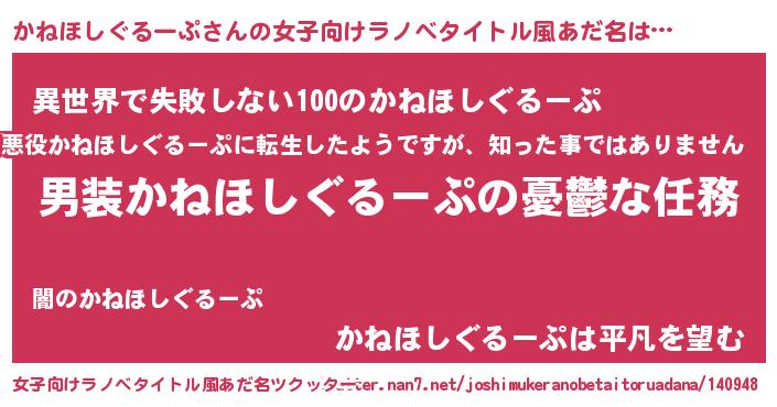 | 男性向けラノベタイトル風あだ名 | 『うちのかねほしぐるーぷが世界を掌握している!』 |