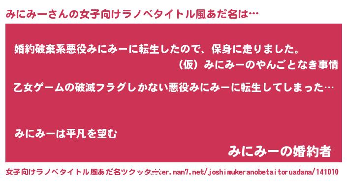 | 男性向けラノベタイトル風あだ名 | 『この素晴らしい世界にみにみーを!』 |
