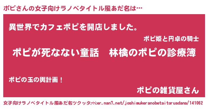 | 男性向けラノベタイトル風あだ名 | 『魔弾の王とポピ』 |