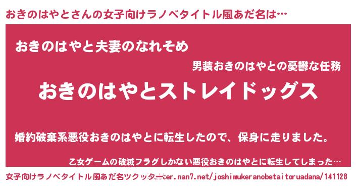 | 男性向けラノベタイトル風あだ名 | 『Re:おきのはやとから始める異世界生活』 |