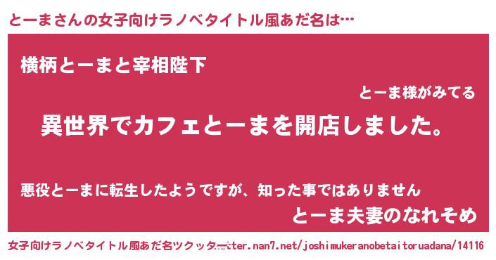 | 男性向けラノベタイトル風あだ名 | 『誰もが恐れるあのとーまが、ぼくの専属メイドになるようです。』 |