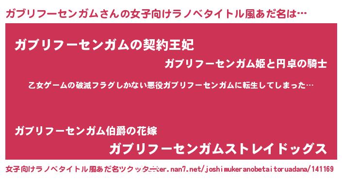 | 男性向けラノベタイトル風あだ名 | 『この素晴らしい世界にガブリフーセンガムを!』 |