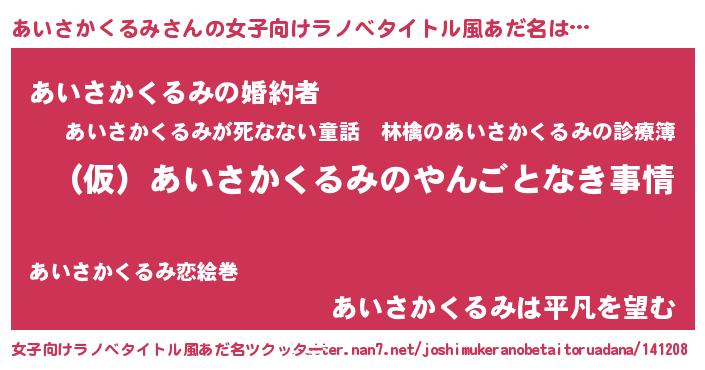 | 胡散臭い通販商品みたいなあだ名 | 『必ず成功するブレスレット…その名も「あいさかくるみ」』 |