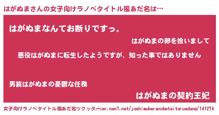 | 男性向けラノベタイトル風あだ名 | 『この素晴らしい世界にはがぬまを!』 |