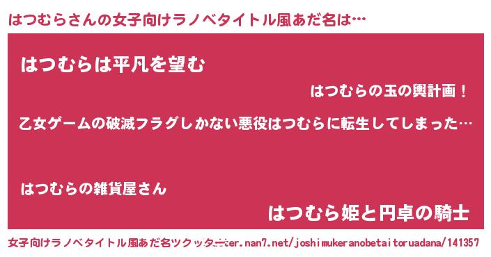 | 男性向けラノベタイトル風あだ名 | 『魔弾の王とはつむら』『はつむらの憂鬱』 |