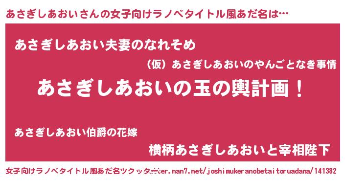 | 男性向けラノベタイトル風あだ名 | 『あさぎしあおい~年齢イコール彼女いない歴の魔法使い~』 |