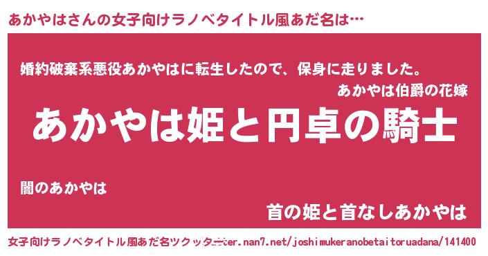 | 男性向けラノベタイトル風あだ名 | 『あかやはの憂鬱』『アカヤハスレイヤー』 |