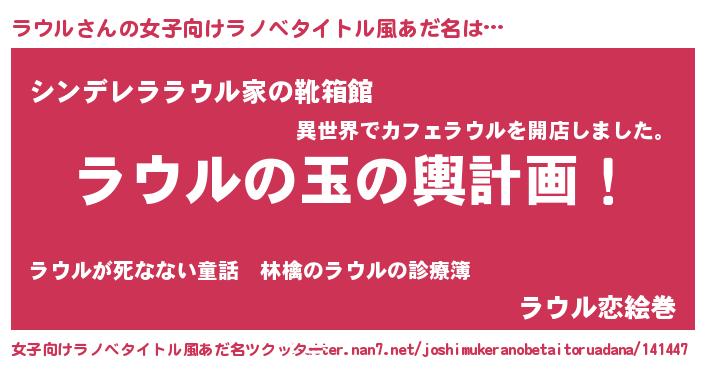 | 男性向けラノベタイトル風あだ名 | 『ラウル~年齢イコール彼女いない歴の魔法使い~』 |