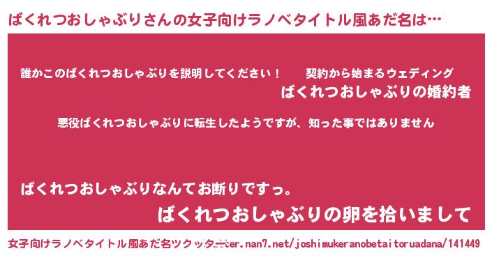 | 男性向けラノベタイトル風あだ名 | 『この素晴らしい世界にばくれつおしゃぶりを!』 |