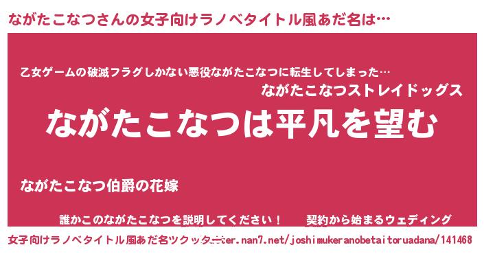 ながたこなつさんの女子向けラノベタイトル風あだ名は… 『ながたこなつは平凡を望む』『乙女ゲームの破滅フラグしかない悪役ながたこなつに転生してしまった…』『誰かこのながたこなつを説明してください! ~契約から始まるウェディング~』 ツクッター #女子向けラノベタイトル風あだ名ツクッター http://tkutter.nan7.net/joshimukeranobetaitoruadana/141468/