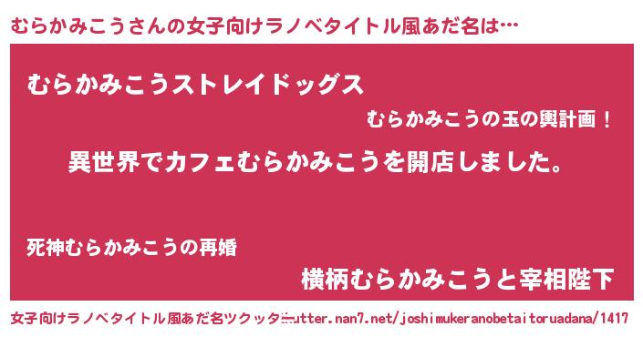 | 男性向けラノベタイトル風あだ名 | 『誰もが恐れるあのむらかみこうが、ぼくの専属メイドになるようです。』 |