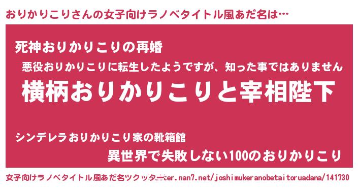 おりかりこりさんの女子向けラノベタイトル風あだ名は… 『横柄おりかりこりと宰相陛下』『死神おりかりこりの再婚』『異世界で失敗しない100のおりかりこり』 ツクッター #女子向けラノベタイトル風あだ名ツクッター http://tkutter.nan7.net/joshimukeranobetaitoruadana/141730/