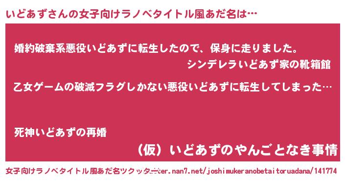 | 男性向けラノベタイトル風あだ名 | 『魔弾の王といどあず』『いどあずの憂鬱』 |
