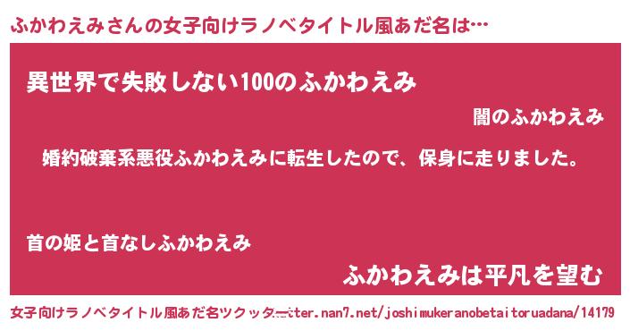 | ヘコむあだ名 | 『ふかわえみ(笑)』『ふか太郎』 |