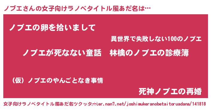 | 男性向けラノベタイトル風あだ名 | 『魔弾の王とノブエ』『ノブエの憂鬱』 |
