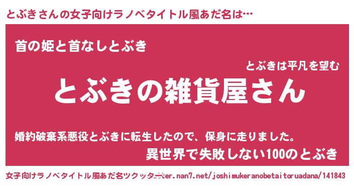 | 男性向けラノベタイトル風あだ名 | 『やはりとぶきの青春ラブコメはまちがっている 』 |