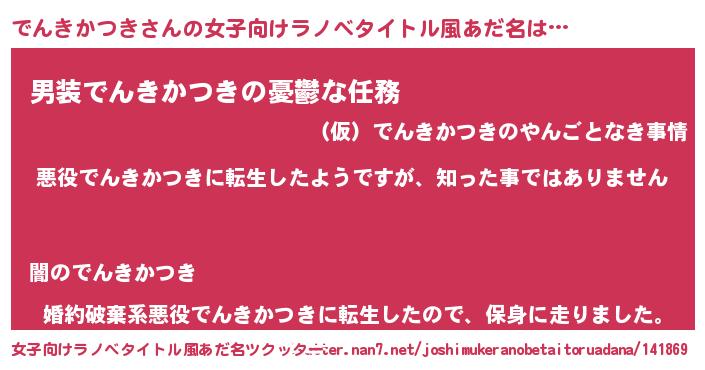 | 男性向けラノベタイトル風あだ名 | 『この素晴らしい世界にでんきかつきを!』 |