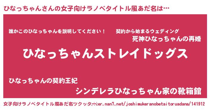 | 男性向けラノベタイトル風あだ名 | 『Re:ひなっちゃんから始める異世界生活』 |