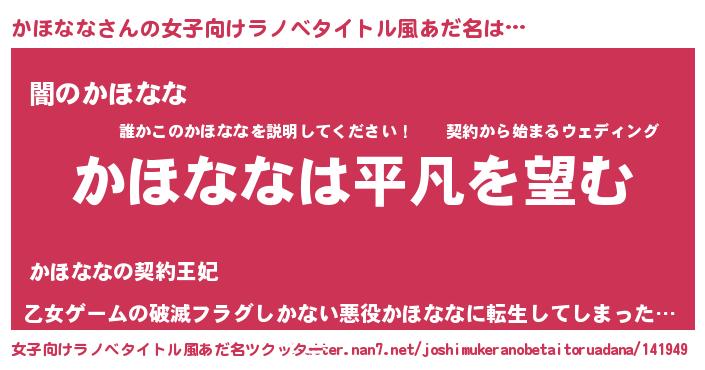 | 胡散臭い通販商品みたいなあだ名 | 『信頼と実績のサプリメント…その名も「かほなな」』 |