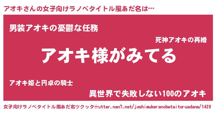 | 男性向けラノベタイトル風あだ名 | 『アオキの嫁は女の子じゃないと思った?』 |