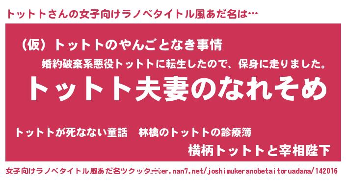 | 男性向けラノベタイトル風あだ名 | 『おまえをオタクにしてやるから、俺をトットトにしてくれ! 』 |