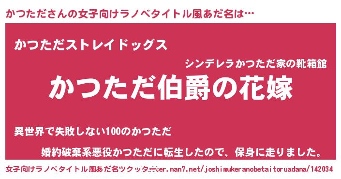 | 男性向けラノベタイトル風あだ名 | 『うちの娘の為ならば、俺はもしかしたらかつただも倒せるかもしれない。』 |