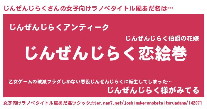 | 男性向けラノベタイトル風あだ名 | 『おまえをオタクにしてやるから、俺をじんぜんじらくにしてくれ! 』 |