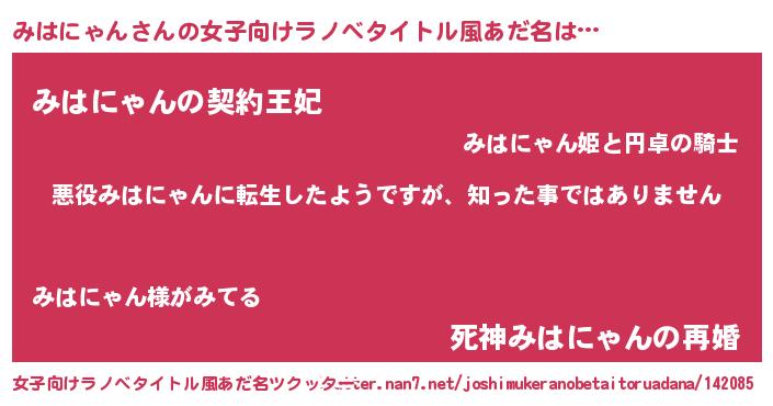 みはにゃんさんの女子向けラノベタイトル風あだ名は… 『悪役みはにゃんに転生したようですが、知った事ではありません』『みはにゃんの契約王妃』『死神みはにゃんの再婚』 ツクッター #女子向けラノベタイトル風あだ名ツクッター http://tkutter.nan7.net/joshimukeranobetaitoruadana/142085/