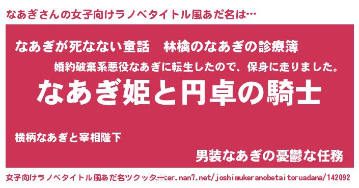 | 男性向けラノベタイトル風あだ名 | 『なあぎの憂鬱』『魔弾の王となあぎ』 |