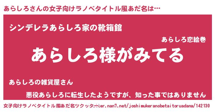 | 男性向けラノベタイトル風あだ名 | 『あらしろの嫁は女の子じゃないと思った?』 |
