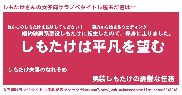 しもたけさんの女子向けラノベタイトル風あだ名は… 『しもたけは平凡を望む』『誰かこのしもたけを説明してください! ~契約から始まるウェディング~』『男装しもたけの憂鬱な任務』 ツクッター #女子向けラノベタイトル風あだ名ツクッター http://tkutter.nan7.net/joshimukeranobetaitoruadana/142140/