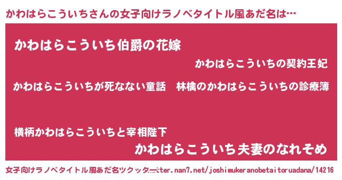 | 男性向けラノベタイトル風あだ名 | 『魔弾の王とかわはらこういち』 |