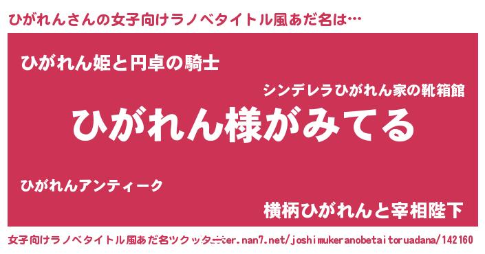 ひがれんさんの女子向けラノベタイトル風あだ名は… 『ひがれん様がみてる』『ひがれん姫と円卓の騎士』『横柄ひがれんと宰相陛下』 ツクッター #女子向けラノベタイトル風あだ名ツクッター http://tkutter.nan7.net/joshimukeranobetaitoruadana/142160/