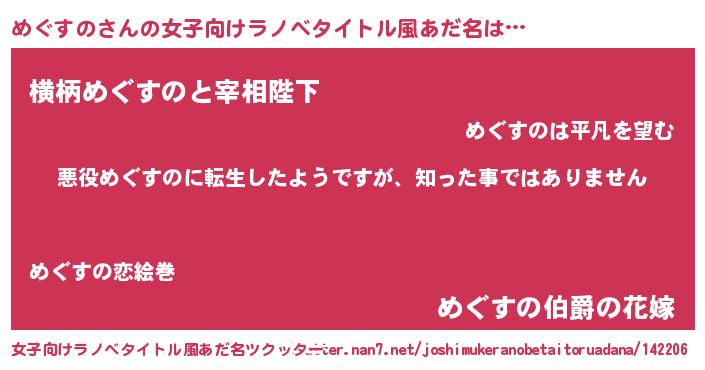 | 男性向けラノベタイトル風あだ名 | 『この素晴らしい世界にめぐすのを!』 |