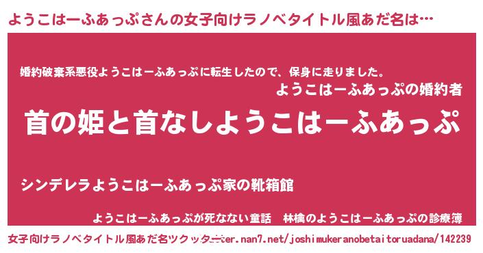 | 男性向けラノベタイトル風あだ名 | 『はたらくようこはーふあっぷさま!』 |