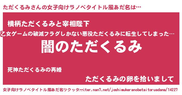 | 男性向けラノベタイトル風あだ名 | 『Re:ただくるみから始める異世界生活』 |