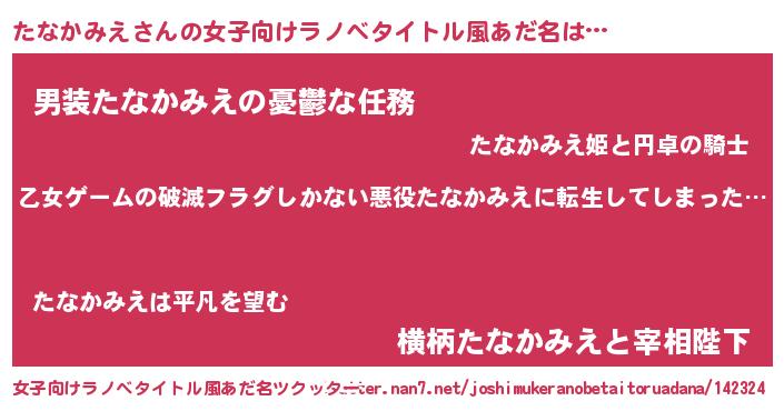 | 男性向けラノベタイトル風あだ名 | 『この素晴らしい世界にたなかみえを!』 |