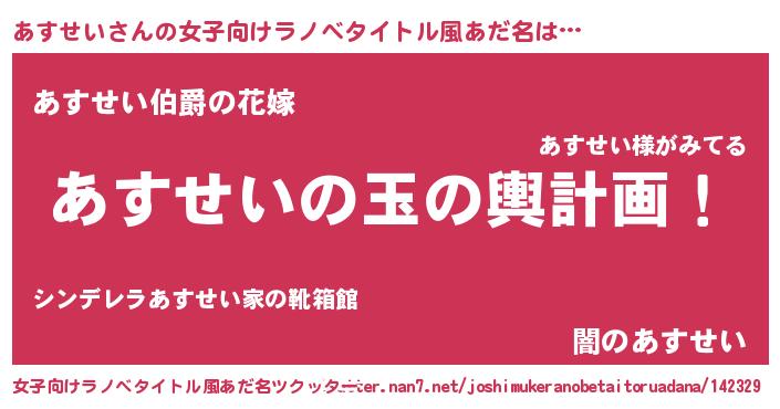 | 男性向けラノベタイトル風あだ名 | 『あすせい~年齢イコール彼女いない歴の魔法使い~』 |